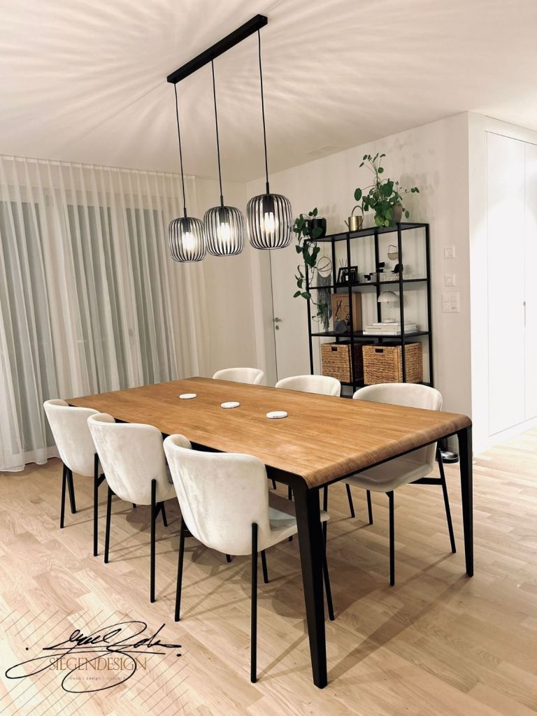 Der Tisch ist im Skandi-Industrie-Stil gestaltet. Er kombiniert die warme, natürliche Ausstrahlung der Holzoberfläche mit den klaren, modernen Linien der schwarzen Metallbeine. Dieser Kontrast aus natürlichen Materialien und industriellen Elementen verleiht ihm eine besondere Eleganz und Vielseitigkeit.