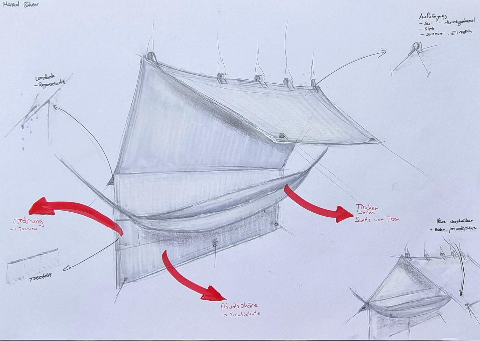 Ich habe ein Konzept für einen tragbaren Shelter entworfen, um ukrainischen Flüchtlingen in ihrer Notlage Sicherheit und Schutz zu bieten. Der Shelter beinhaltet einen erhöhten Schlafbereich, der vor Bodengefahren wie Tieren schützt, sowie ein integriertes System zur geordneten Aufbewahrung persönlicher Gegenstände. Ein zusätzlicher Sichtschutz sorgt für Privatsphäre. Dieses Design zielt darauf ab, nicht nur eine Unterkunft, sondern auch einen Ort der Würde und Sicherheit in einer schwierigen Zeit zu schaffen.